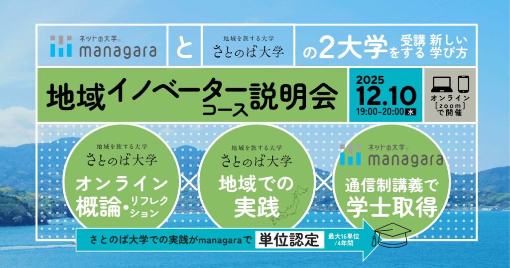 | ネットの大学managara × さとのば大学 地域イノベーターコース説明会 | 気軽にLINEで/ゆっくりオンラインで 個別相談 | |