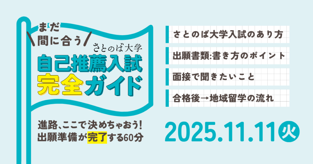 | 2025/11/11 (火) | 20:00-21:00 | 〇 | 🟦進路、ここで決めちゃおう! さとのば大学自己推薦入試「完全ガイド」 | |||