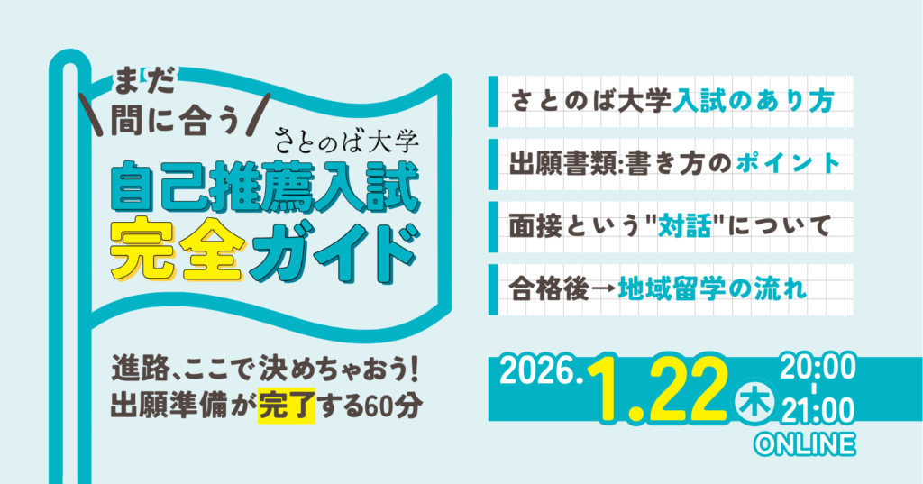 | 2026/01/22 (木) | 20:00-21:30 | 進路、ここで決めちゃおう! さとのば大学自己推薦入試「完全ガイド」 |