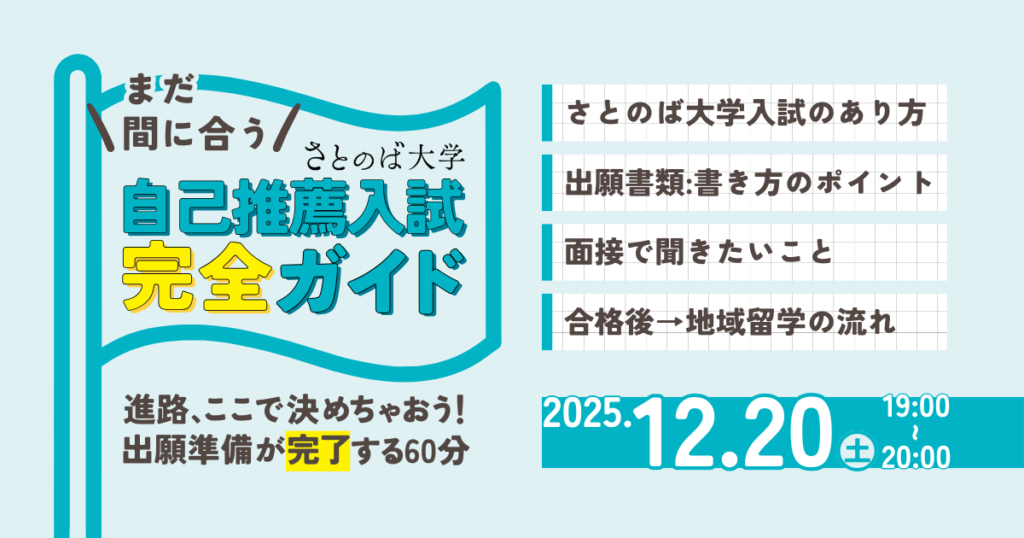 | 2025/12/20 (土) | 19:00-20:00 | 〇 | 🟦進路、ここで決めちゃおう! さとのば大学自己推薦入試「完全ガイド」 | |||