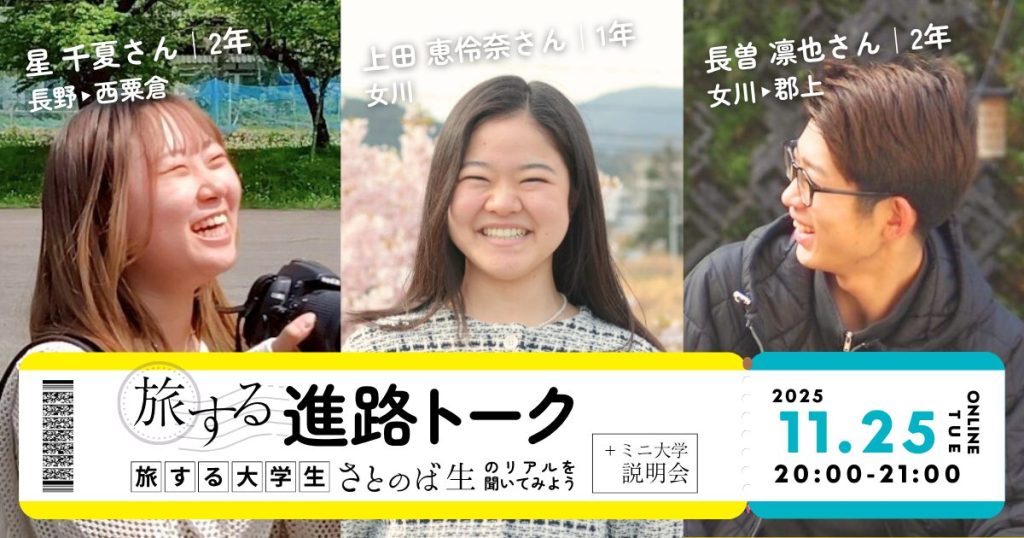 | 2025/11/25 (火) | 20:00-21:00 | 〇 | 🟨旅する進路トーク(さとのば生登壇) | |||