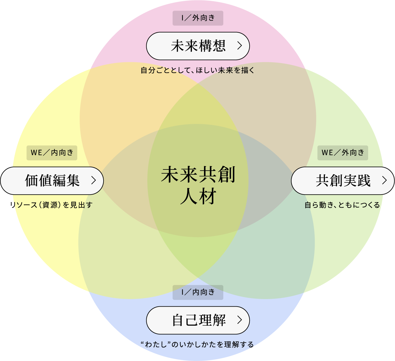 さとのば大学では「共創」の土台である「I / WE」「内向き / 外向き」という2軸をもとに、次の4つのアプローチで整理し、カリキュラムデザインの柱であるSATONOVA WAYを定めています。これらの2軸は二項対立ではなく重なり合い、順番に起こるものではなく同時に起こっています。さとのば大学の卒業生は、この2軸のバランスに優れているからこそ、未来共創人材として、自分や他者、地域の資源をいかしながら、多様なステークホルダーとともにこれからの社会をつくっていくキーパーソンになります。SATONOVA WAYと 16のコンピテンシーをベースに、成長指針を独自のルーブリックで明確化し、学生・連携地域・大学とで共有することで、未来に資する人材を育成していきます。